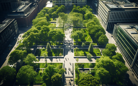 This stunning aerial image captures a symmetrical garden layout showcasing vibrant greenery and intricate pathways, creating a tranquil urban oasis.