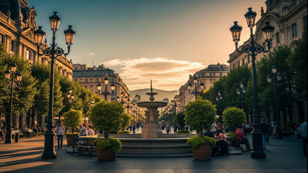 Bustling city square featuring elegant historic buildings, a central fountain, and people walking and sitting outdoors