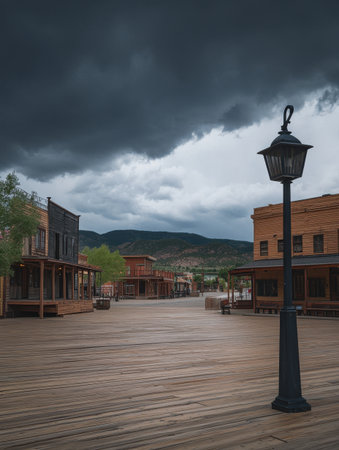 Dramatic Western Town Square Dark Clouds Wooden Buildings Lamppost sky old day grey wild view mood