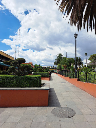 Tepotzotlan, State of Mexico, Mexico - Jul 12 2023: Magical Mexican town with colonial streets, park, restaurants to enjoy on vacations and weekends