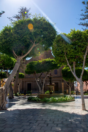 Beautiful green square near the old church in La Laguna city on a sunny day. Traveling spanish city on Tenerife island