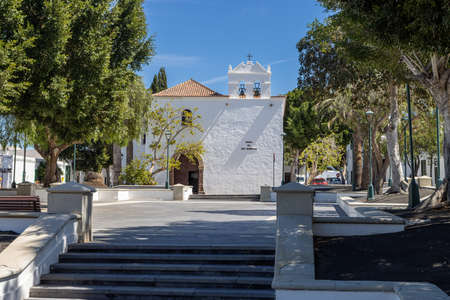 Park on Square of Help (Plaza de los Remedios) infront of a very well preserved historical church with a belfry. Bright blue sky. Yaiza, Lanzarote, Canary Islands, Spain.