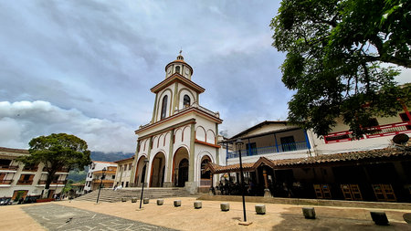 Alexandria, Antioquia - Colombia. November 16, 2025. Photograph of downtown Alexandria, showing the church facing the plaza, green trees, and colonial architecture