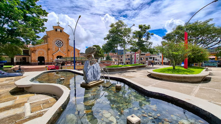 Main square of Sutamarchan, in Boyaca, Colombia: in the foreground a water fountain and in the background the Our Lady of Health Parish, the main Catholic temple of the town.