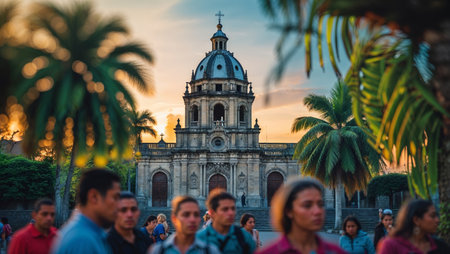 Crowd of people walking in a park near a historic building at sunset in a vibrant location with palm trees