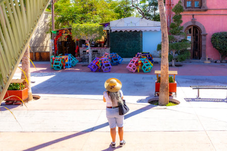 Female tourist standing in plaza looking at colorful tables and chairs of Mexican restaurant, wall of colonial building, back to camera, Loreto, Baja California Sur, Mexico