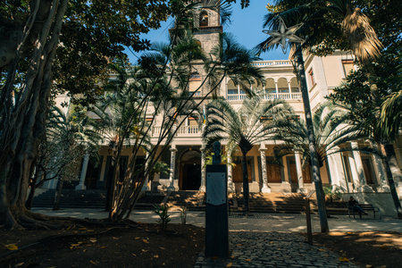 La Laguna, Tenerife, Spain - April 07, 2019. Colourful cozy streets of old capital of the Islaland. Many monuments of history and architecture, churches. Popular tourist destination and attraction.