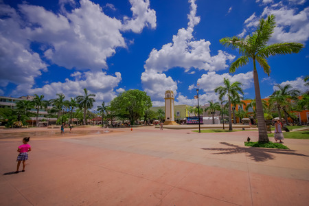 COZUMEL, MEXICO - MARCH 23, 2017: The monument of watchtower in plaza del sol in san Miguel, Cozumel, that are frequently by tourist from aroun the world.