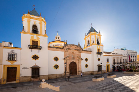 RONDA, SPAIN - DECEMBER 14, 2017: Church of our Lady (Iglesia de Nuestra Senora del Socorro) on Plaza del Socorro square decorated with Christmas holiday decoration, Ronda city, Andalusia, Spain