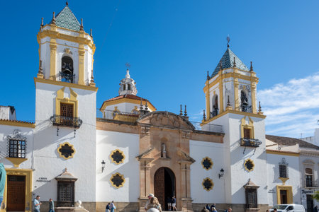 Ronda, Spain - Nov 10, 2025: Visitors explore Iglesia del Socorro church in Ronda under blue sky.