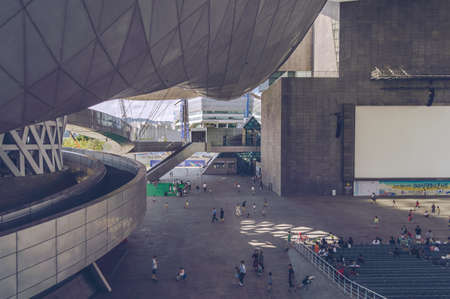 Busan, South Korea September 15, 2019: view from above on people enjoying holidays with kids at outdoor area of film centre