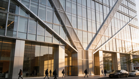 bustling corporate office with sleek, modern interiors, employees collaborating in a vibrant open space, sunlight streaming through glass walls, ultra-realistic, professional vibe