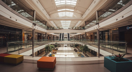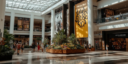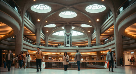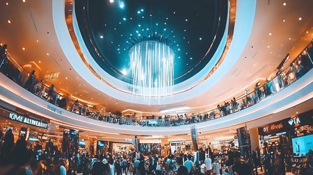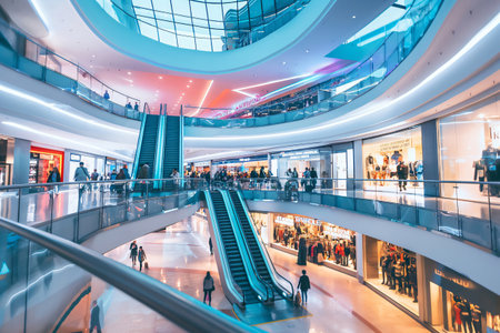 Bustling shopping mall interior with shoppers riding escalators and walking between stores