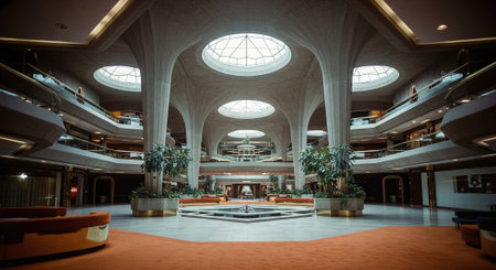 An interior shot of a contemporary mall featuring fluid architecture and ambient lighting designs