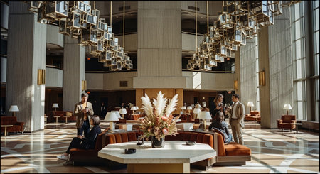 Modern, light-filled lobby in a large, contemporary building. People are moving through the wide space. The light reflects beautifully off the polished marble floor. The lobby features a minimalist design with clean lines. Stone walls and tall windows complete the elegant and spacious design.