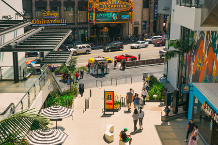 Los Angeles, California, USA - April 26, 2023. Famous Hollywood Walk of Fame in a bright sunny day, view from the Ovation shopping center