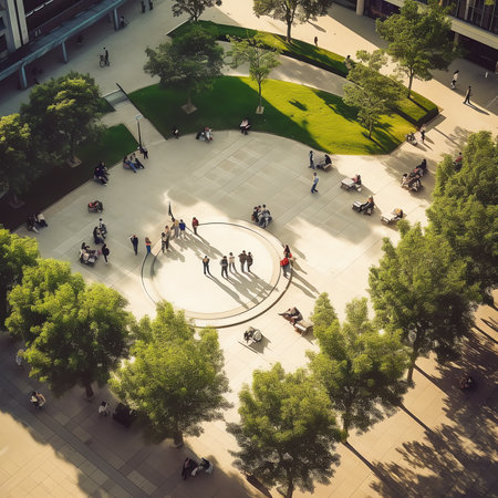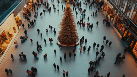 people walking through shopping center, aerial view of busy city street, created with generative ai
