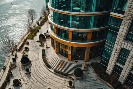From a low angle perspective, a towering glass skyscraper pierces the overcast sky, its modern facade reflecting the cool tones of dusk.