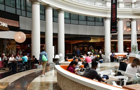 Moscow, Russia - November 13, 2019: A lot of people walking and sitting by the tables, eating in a cafe at foodcourt in shopping mall, center