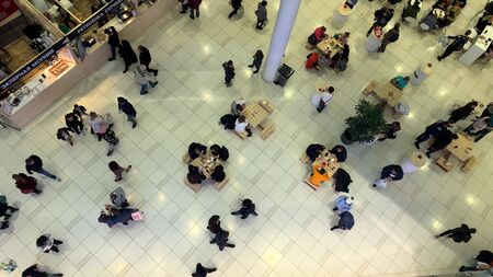 People sitting eating in food court, cafe, restaurant in shopping mall top view