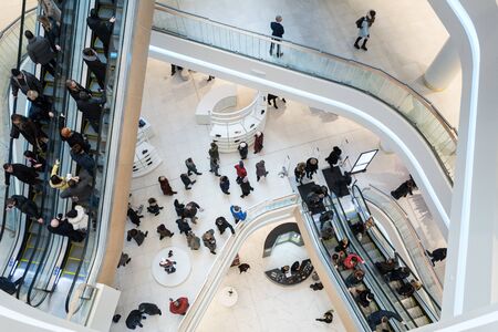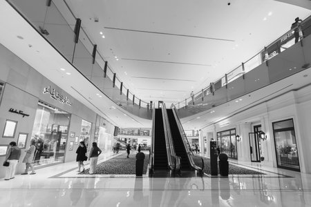 Dubai, UAE - 12.01.2019: People walking by and shopping inside of the Dubai Mall. Several shopping floors, busy as usual.