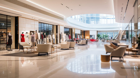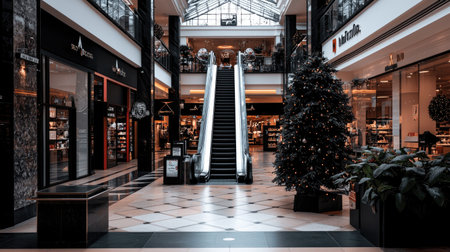 A serene view of a modern shopping mall featuring an escalator, elegant shops, and holiday decorations, creating a tranquil shopping atmosphere.