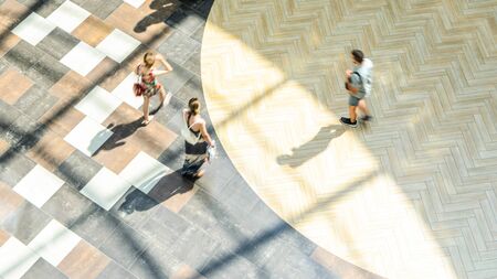 Silhouettes of Walking People in the Atrium of a Large Public Building, View from Above. Blur in Motion, Long Exposure. Abstract Background