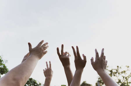 Hands of a group dancing people in the sky at sunset. Concert. Friendship and family together. Carefree event, summer party