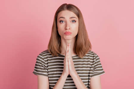 Portrait of nervous pleading lady hands together ask help look camera on pink background