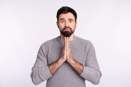 Portrait of man showing clasped hands, asking for help or excuse. Please, forgive me the concept