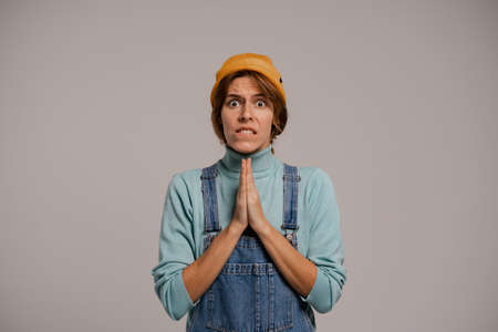Photo of cute female hipster prays and waits for something so much. White woman wears denim overall and hat isolated grey color background