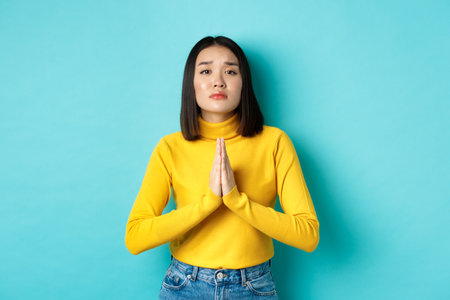 Young attractive asian girl begging for favour, need something and asking please, holding hands in pray, standing over blue background