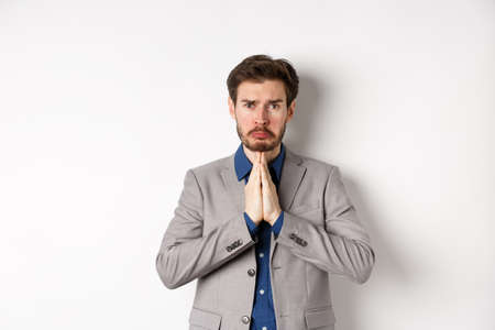 Miserable whining businessman asking for loan, need help and begging you, sobbing and say please with sad face, standing on white background, ask for forgiveness