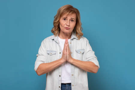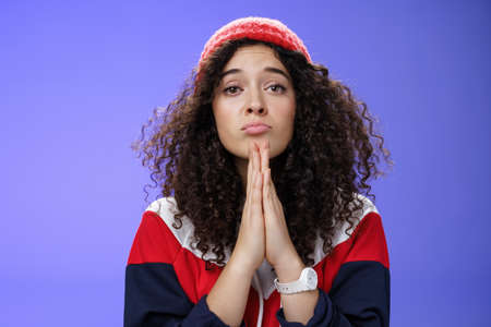 Close-up shot of cute feminine girlfriend begging bring her favorite sweets holding hands in pray folding lips and gazing with angel innocent gaze at camera as asking favour over blue background