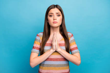 Close-up portrait of her she nice-looking lovely pretty charming cute feminine desperate girl asking forgiveness isolated over bright vivid shine vibrant blue color background