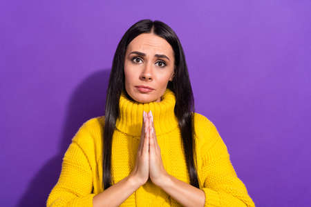 Portrait of young pleading girl arms palms together look camera sullen face isolated on purple color background