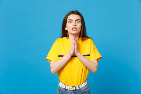 Portrait of shocked young woman in vivid casual clothes looking camera, holding hands folded, praying isolated on bright blue wall background in studio. People lifestyle concept. Mock up copy space.