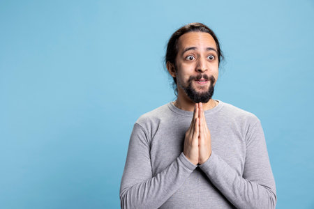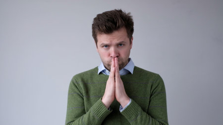 Man Expressing Hope and Pleading Gesture with Hands Clasped