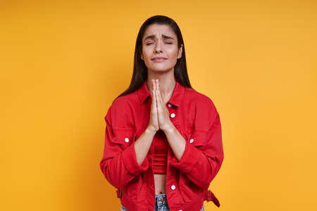 Beautiful woman holding hands clasped and eyes closed while standing against yellow background