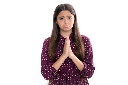 Funny face. Teenager child girl praying with sad expression over white background. Portrait of cute teenager holding hands in prayer gesture, praying about something.