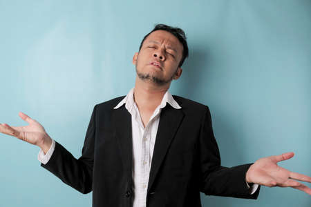 A portrait of Asian businessman wearing black suit look so confuse, isolated by a blue background