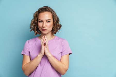 Young ginger woman with wavy hair posing with holding palms together isolated over blue background