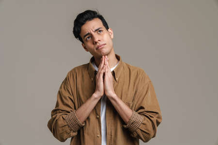 Brunette hispanic man holding palms together and looking upward isolated over grey background