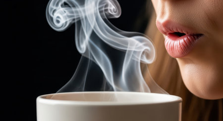 Woman lips gently blowing on a hot beverage in a white cup, with steam rising against a dark background. conveys warmth, comfort, and relaxation.