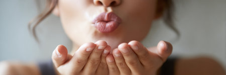 Close-up of hands forming a blowing kiss gesture in warm light, highlighting intimate and gentle expression against a neutral background.