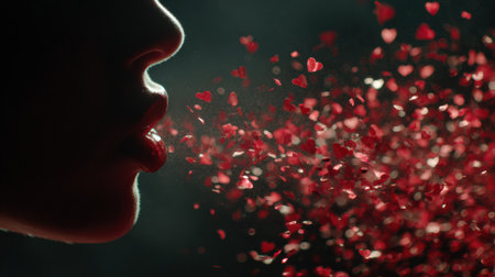 Heart-shaped confetti blows from lips in a silhouette against a soft black backdrop, creating a dreamy and romantic scene.