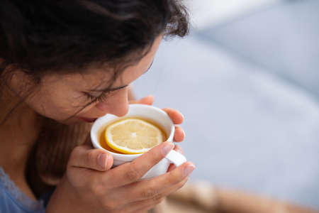 Close-up shot of the young woman at home with a viral infection. The woman is drinking hot tea with lemon. Pandemic, on self-isolation.
