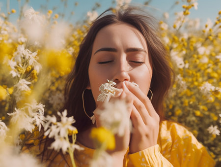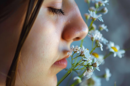 Young woman is smelling a bouquet of chamomile flowers with her eyes closed, enjoying the scent