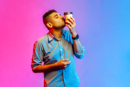 Portrait of handsome young adult man in shirt kissing disposable cup of take away coffee, enjoying beverage, needs energy. Indoor studio shot isolated on colorful neon light background.