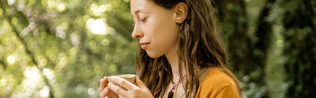 Side view of brunette woman holding tea bowl in summer forest, banner